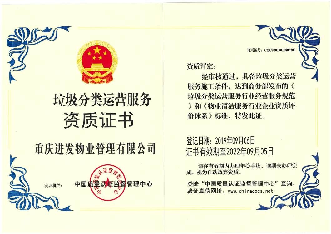 衷心感謝您對重慶進發城市管理服務有限公司的關注和支持!重慶進發城市管理服務有限公司自2001年創建以來,始終秉承“求真務實、開拓創新、銳意進取、誠實守信”的企業精神,以客戶滿意為中心,育人才、建制度、塑靈魂,在創新中求發展,在發展中不斷壯大。同時,在走向成功的道路上,始終離不開各級政府部門和客戶單位的關心與支持...
